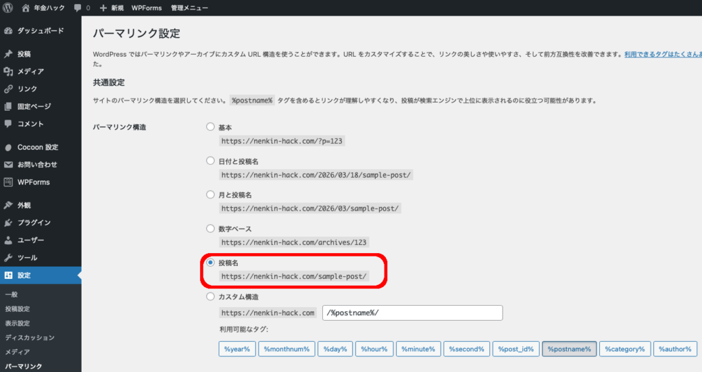 この設定にすると、記事URLがシンプルになります。