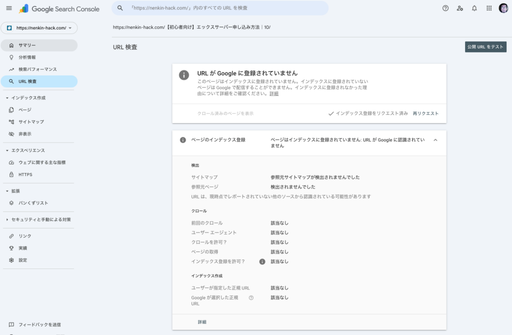 URL検査 → インデックス登録をリクエスト