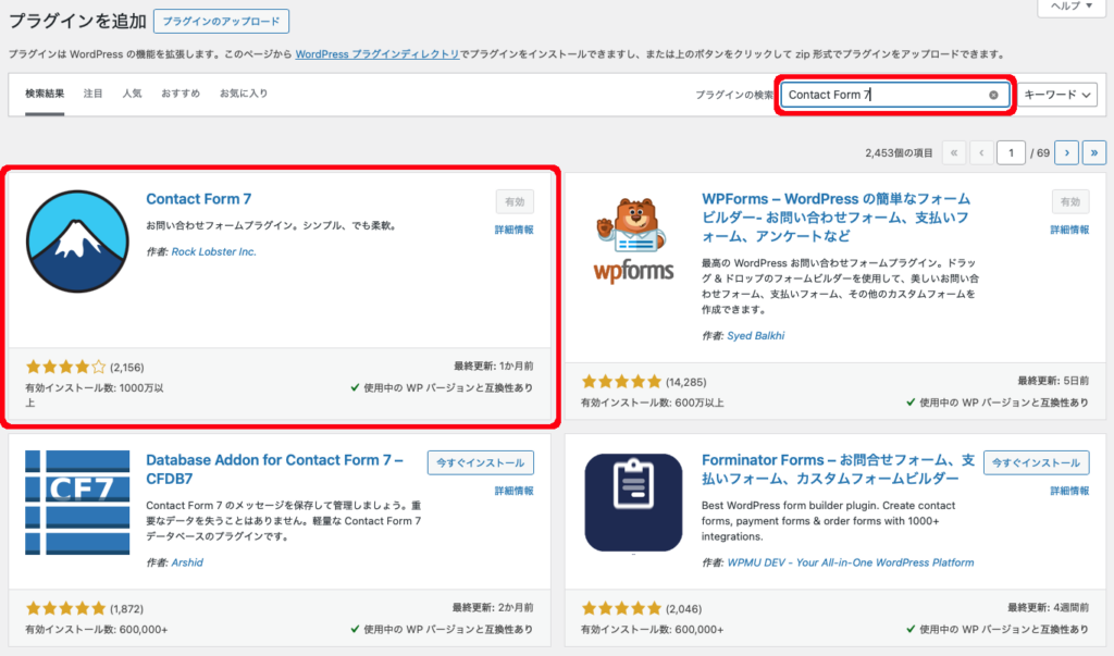 で「Contact Form 7」と検索し、インストールして有効化します。